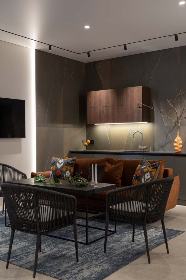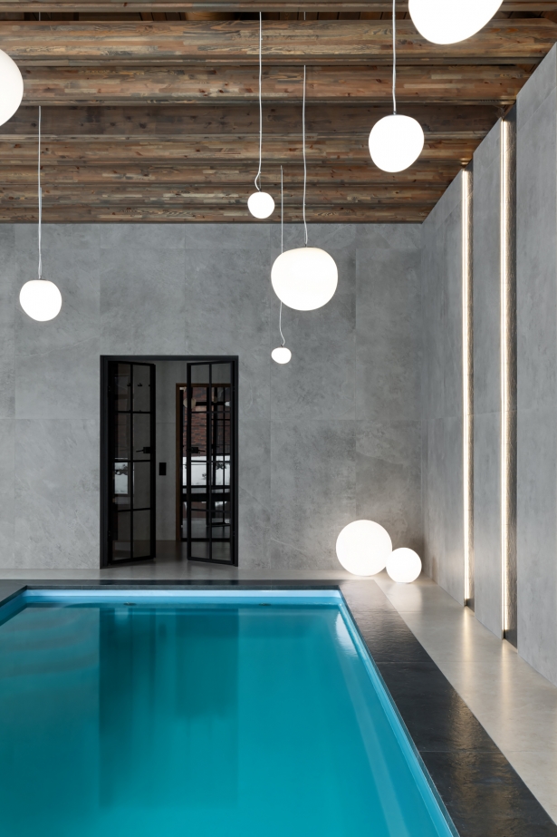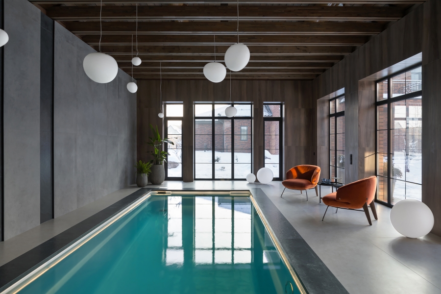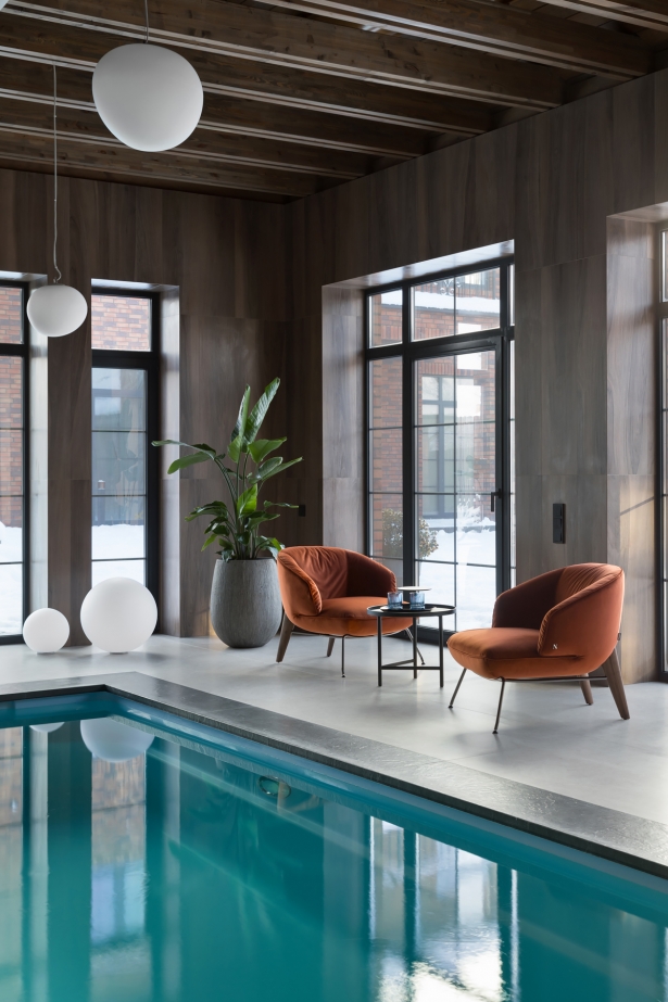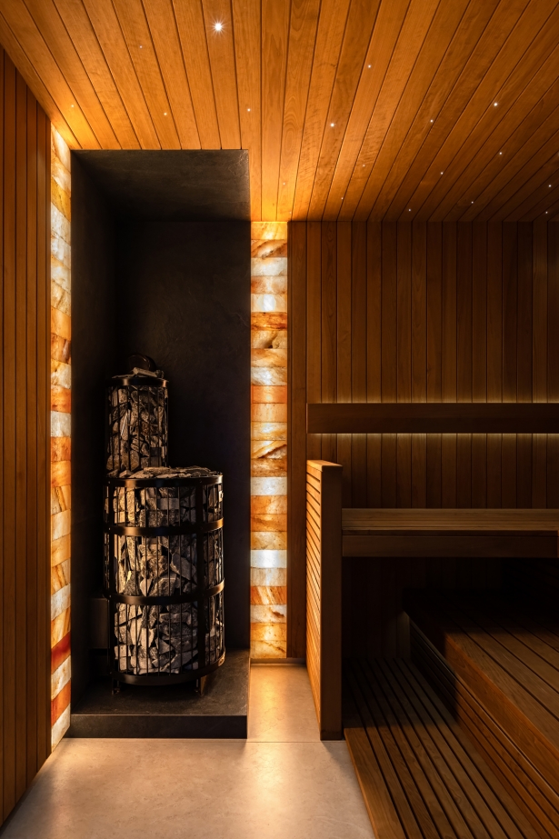 L’interior si basa su tonalità profonde, legno e illuminazione calda, creando un’atmosfera avvolgente e coerente. Il complesso comprende una zona living con cucina, un’area barbecue stagionale, sauna, doccia e piscina. La vasca è rivestita in gres porcellanato con illuminazione integrata, mentre la sauna è valorizzata da inserti retroilluminati in sale himalayano.