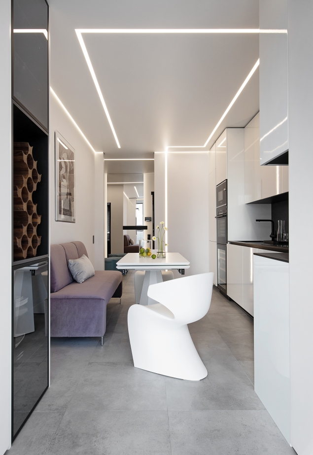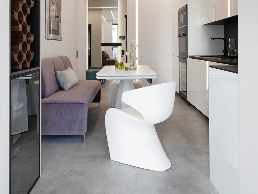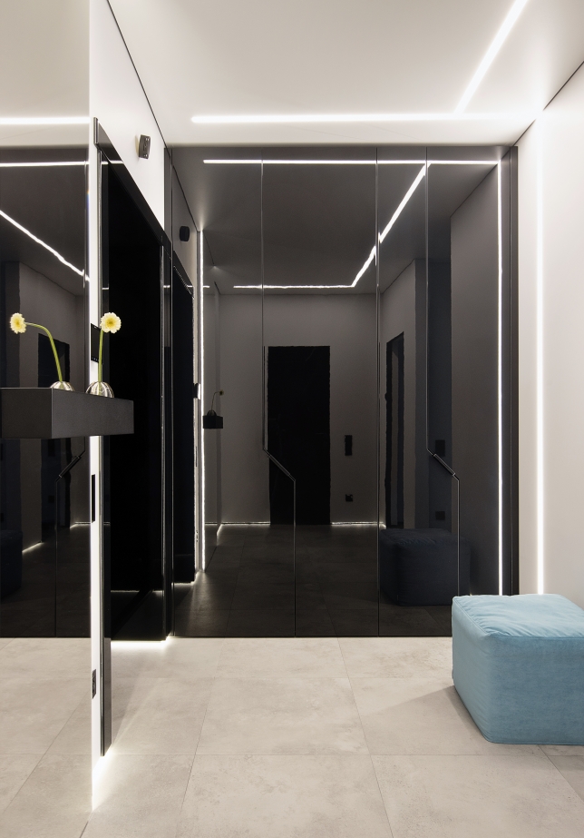 Questo appartamento è stato progettato per un giovane uomo che apprezza la sintesi formale, la tecnologia e un’estetica decisa e maschile. L’interior in stile high-tech combina superfici lucide, una palette contrastante in bianco e nero e arredi dalle forme futuristiche, creando un’atmosfera da “spazio del futuro”. Il concept si basa su una geometria rigorosa, materiali innovativi e una scenografia luminosa studiata nei minimi dettagli. Il battiscopa a scomparsa con illuminazione integrata fa “fluttuare” visivamente gli arredi, mentre gli elementi di design su misura sottolineano l’esclusività dello spazio.