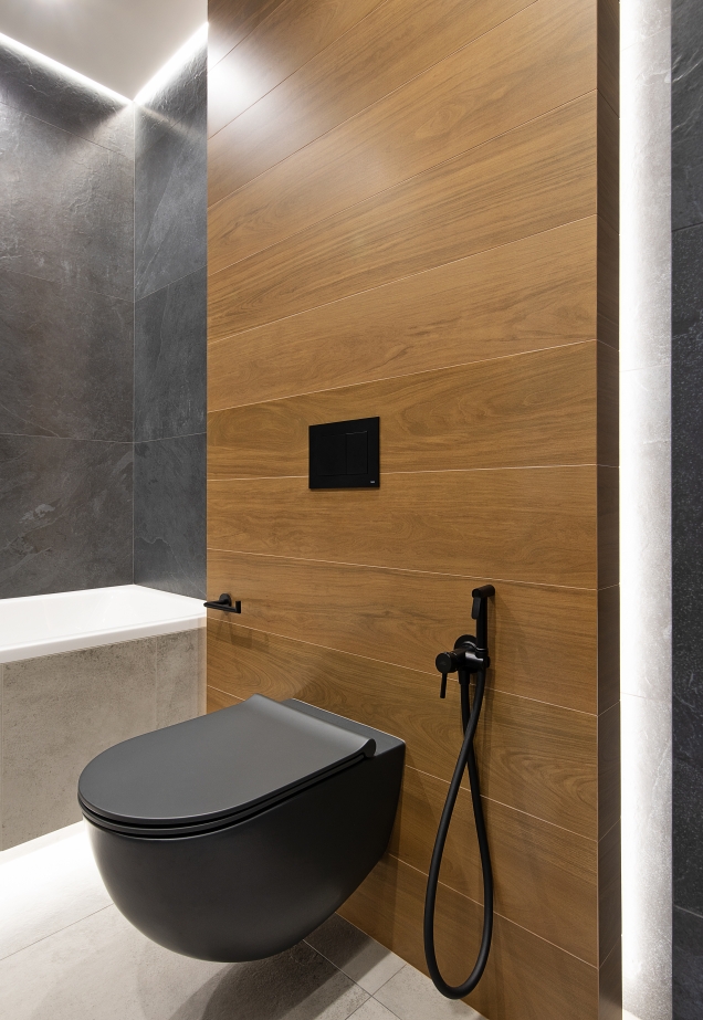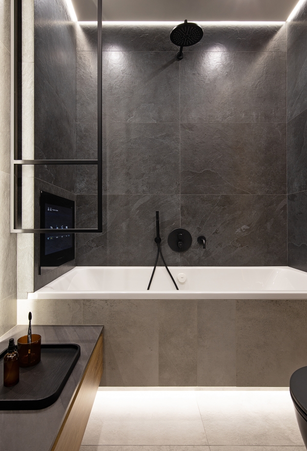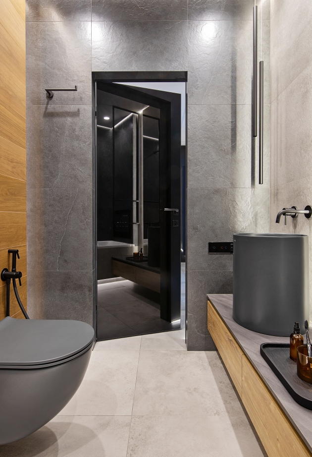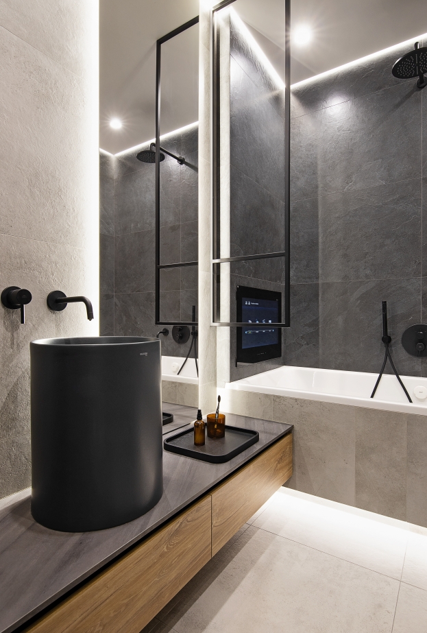Il gres porcellanato Italon riveste un ruolo fondamentale nella finitura dei bagni. Nella zona doccia è stato utilizzato un gres effetto pietra tridimensionale che, grazie all’illuminazione a soffitto, prende vita attraverso giochi di luce e ombra. Il “legno” scuro ed elegante della collezione Skyfall Palisandro attenua la freddezza dello stile high-tech, aggiungendo calore tattile. Le superfici grigie effetto cemento nel bagno e nei pavimenti di ingresso e cucina creano un’atmosfera industriale e decisa, mantenendo al tempo stesso un’eleganza raffinata. Un interior pensato per chi cerca l’equilibrio tra tecnologia, estetica audace e comfort consapevole.