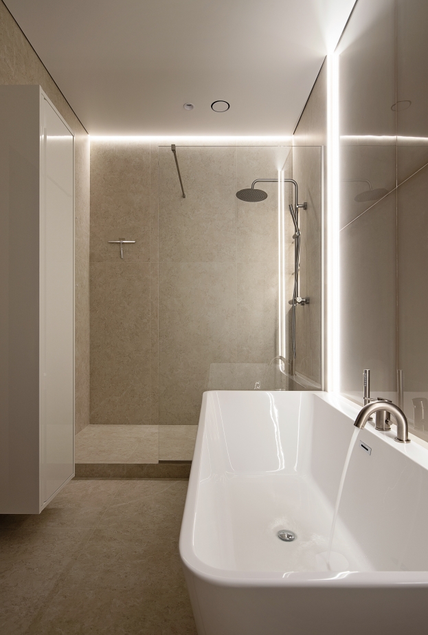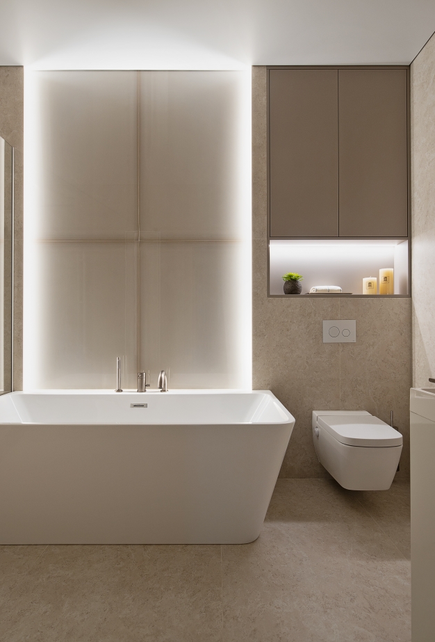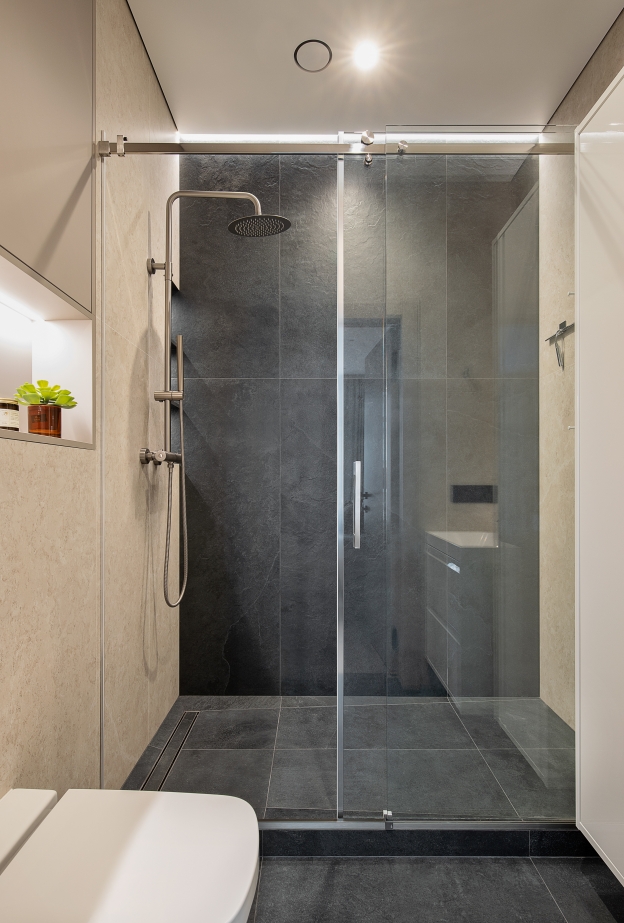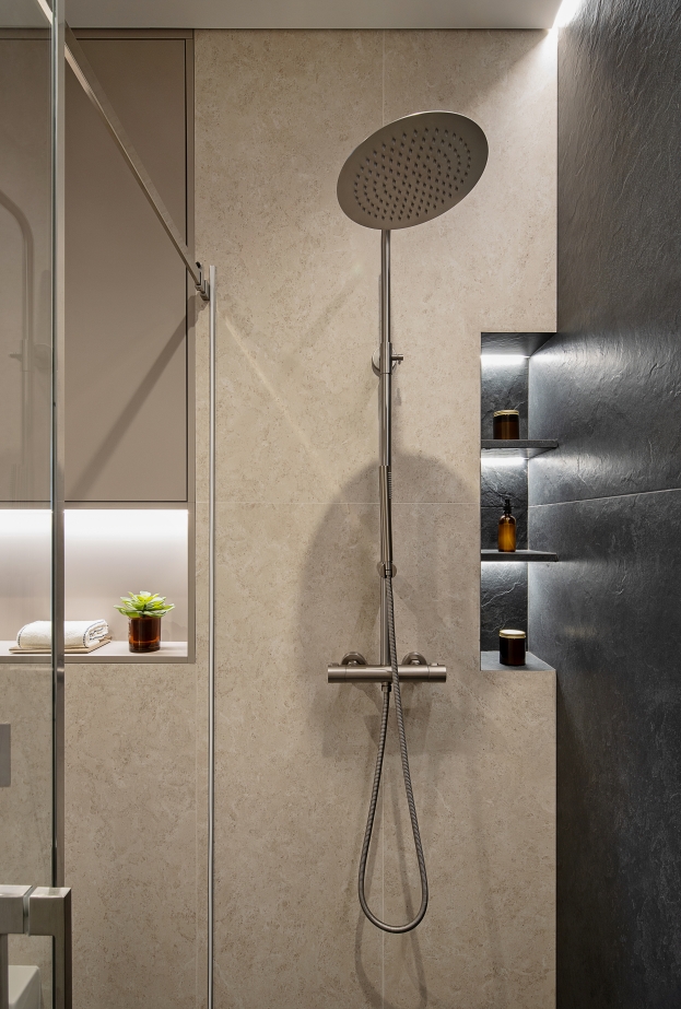 L’illuminazione ha un ruolo centrale: i corpi illuminanti in vetro rigato creano riflessi morbidi e rafforzano l’atmosfera accogliente. Elemento chiave del progetto è l’utilizzo del gres porcellanato Italon nei bagni. Nel bagno principale, Metropolis Glass Sand con illuminazione soffusa crea profondità e luminosità, mentre nel secondo bagno l’abbinamento con la collezione Materia valorizza la texture della zona doccia.